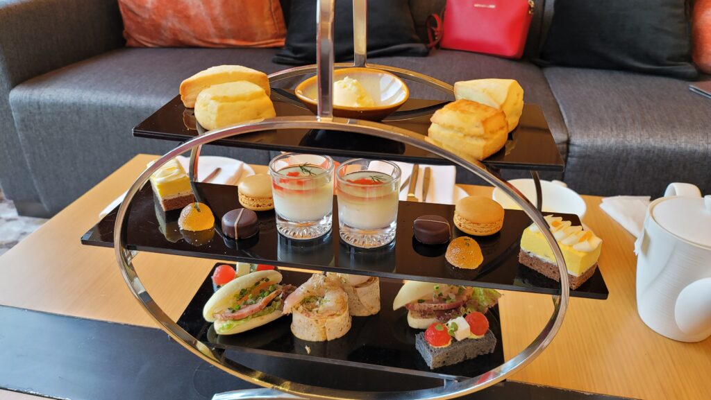 そして再びラウンジへ。アフタヌーンティーは大人のみのサービスで、子どもにはクッキーやジュースの提供でした。アフタヌーンティーセットは高級ホテルにふさわしく季節感を取り入れたスイーツやセイボリーがキレイに盛られていました。当然のように子どもにたくさん持っていかれましたがどれも美味しかったです。