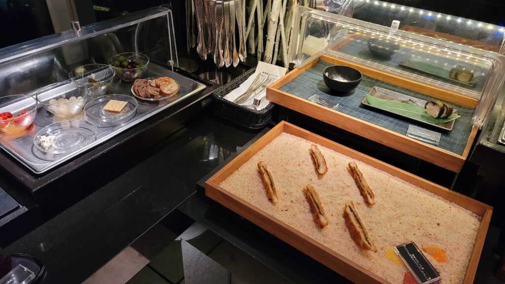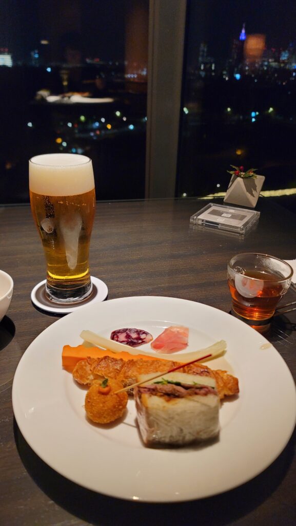 さて、夕方からはラウンジも大人タイムなので中学生以下は入れません。部屋で子ども用のルームサービスを頼みつつ、夫婦で交替で楽しみます。