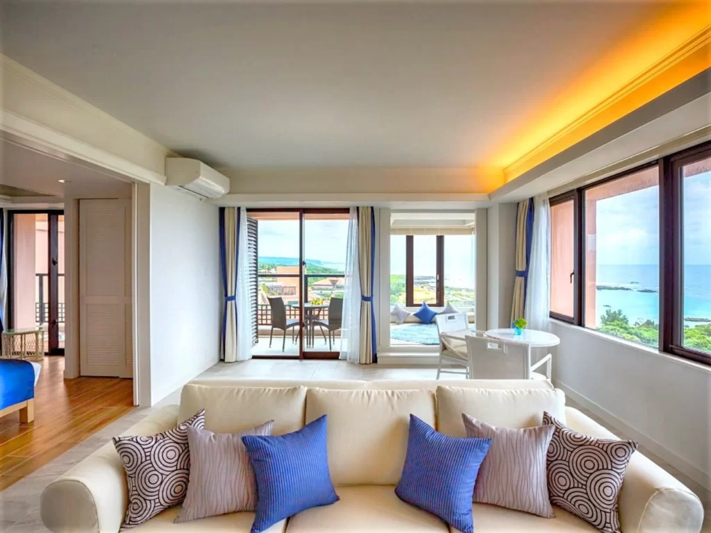 羽田からは那覇乗り継ぎが一般的ですが、子連れでの乗り継ぎの負担を考え宮古島直行便をセレクト。空港からの送迎は予約不要で、宮古空港到着後に専用カウンターにて受付。ほとんどの方はレンタカーだったのか季節柄なのか、あまり混雑はしていませんでした。20分ほどでホテルに到着。エントランスを抜けてカウンター前のラウンジスペースでチェックイン。ウェルカムドリンクを出して下さり、子どもにはウミガメのぬいぐるみを頂きました!初来訪につき初日はデラックススイート1ベッドルーム、2日目はプールヴィラプレミア2F、と2種類の部屋にお邪魔してみました。こちらのホテル、ミラージュフロアというクラブフロアがあり、クラブラウンジがあるのですが、未就学児は昼夜問わず入室不可なので注意が必要です。(ミラージュフロア、プールヴィラプレミア宿泊者対象)